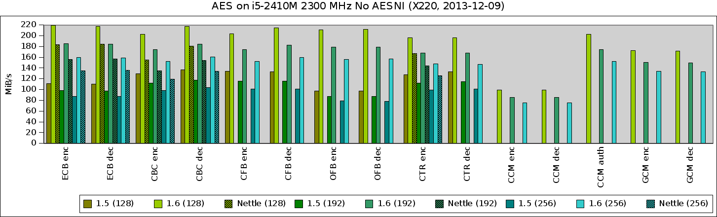 For each encryption mode you see three groups of bars; one for each cipher size. The first group is for Libgcrypt 1.5, the second for 1.6, and the third for Nettle. Note that only 1.6 implements all modes.